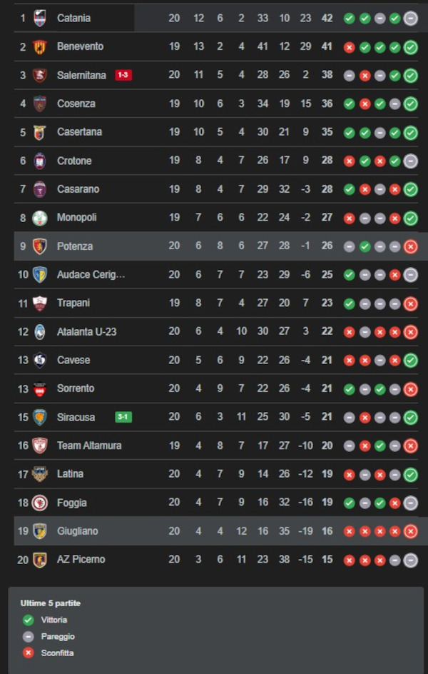 Si è chiusa poco fa la partita tra il Potenza Calcio e il Giugliano.