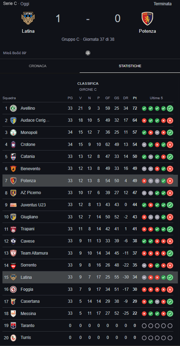 Si è chiusa poco fa la partita tra Latina e Potenza Calcio.
