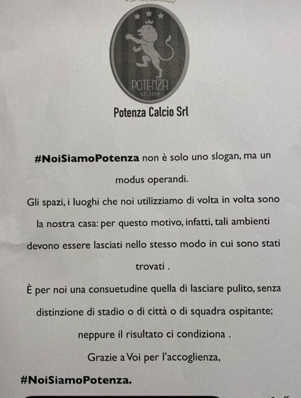 Insieme alla foto dello spogliatoio lindo e pinto il messaggio, con il plauso della società rosanero, lasciato dallo staff del Potenza: