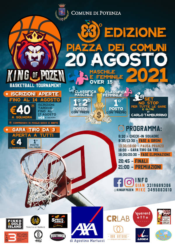 Venerdì 20 agosto 2021 (dalle ore 9:00 fino alle ore 21:00), si svolgerà nel bellissimo scenario del Parco dei Comuni di Potenza una giornata di sport e divertimento con la III edizione del “King of Pozen”, manifestazione di pallacanestro diventata ormai un appuntamento fisso di fine estate per gli amanti della palla a spicchi.