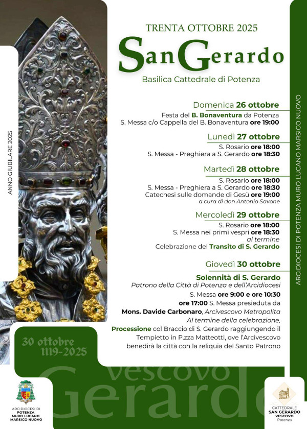Il culmine delle celebrazioni si avrà giovedì 30 ottobre, giorno della Solennità di San Gerardo, Patrono della Città di Potenza e dell’Arcidiocesi.