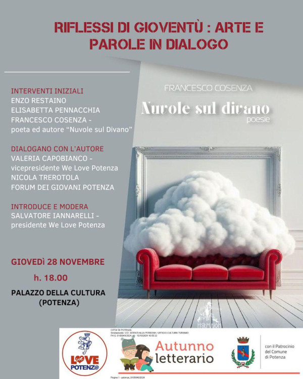 “Riflessi di gioventù: arte e parole in dialogo” è una serata dedicata alla riflessione e al confronto, ispirata dal libro di poesie “Nuvole sul divano”, scritto da Francesco Cosenza e pubblicato dalla Edizioni Hermaion.