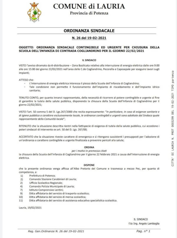 Il Sindaco di Lauria (PZ), Angelo Lamboglia, comunica:
