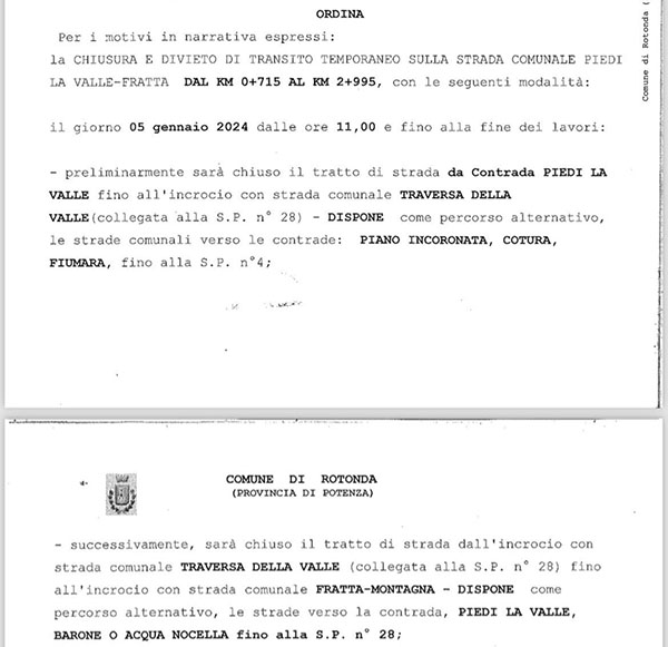 “Causa rifacimento del manto stradale, con ordinanza n. 98 del 04/01/2024, è stata disposta la chiusura del tratto di strada comunale “Piedi la Valle – Fratta” dal KM 0+715 al KM 2+995 secondo le modalità indicate nell’ordinanza sotto riportata”.