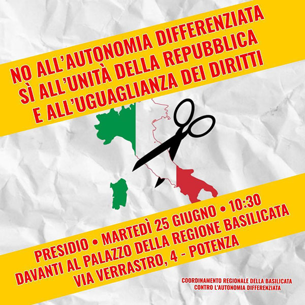 Il Coordinamento regionale della Basilicata contro l’autonomia differenziata ( costituito da forze politiche, sindacati, associazioni, comitati) annuncia un presidio contro l’autonomia differenziata, l’unità della Repubblica e l’uguaglianza dei diritti che si terrà Martedì 25 Giugno dalle 10.30 a Potenza in via Verrastro (davanti al palazzo della Regione).