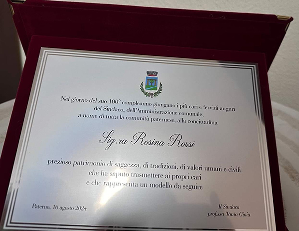 Il Sindaco, il Parroco e l’Amministrazione comunale di Paterno hanno portato gli auguri e l’abbraccio di tutta la comunità a nonna Rosina che, circondata dall’affetto e dal calore dei propri familiari, ha festeggiato il traguardo dei 100 anni di età.