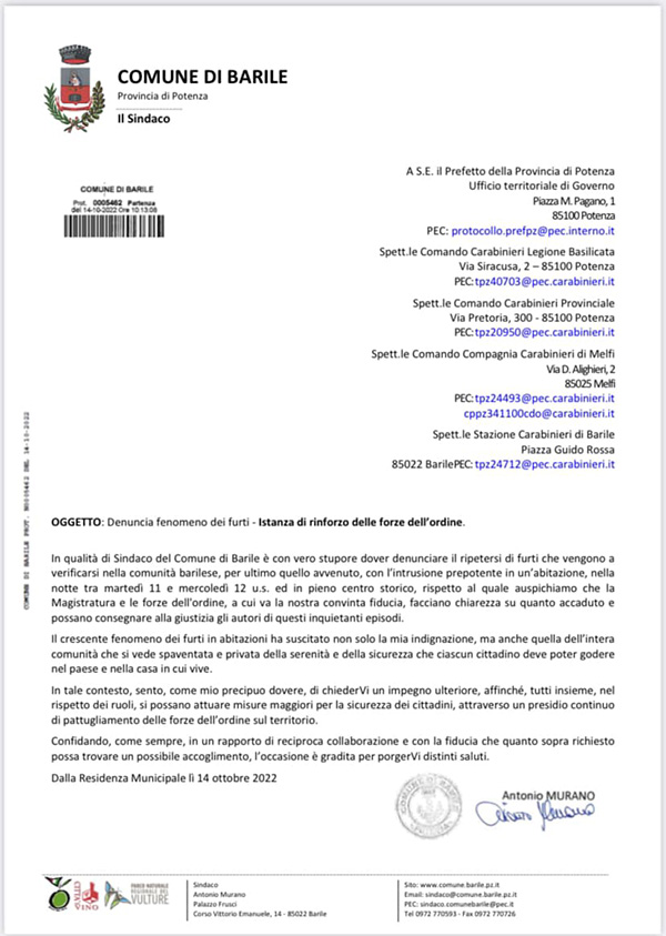 Il sindaco di Barile, Antonio Murano, denuncia numerosi furti e chiede per questo motivo un rinforzo delle forze dell’ordine.