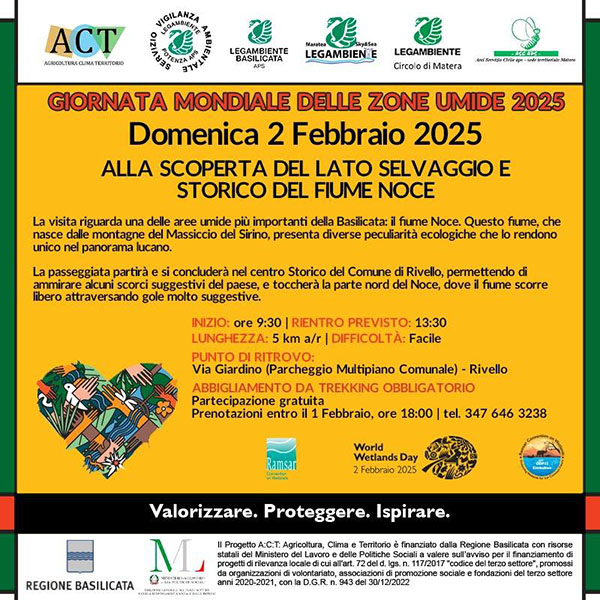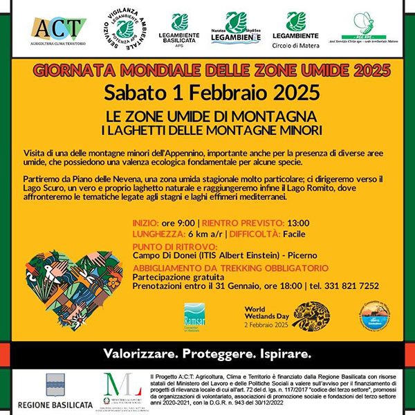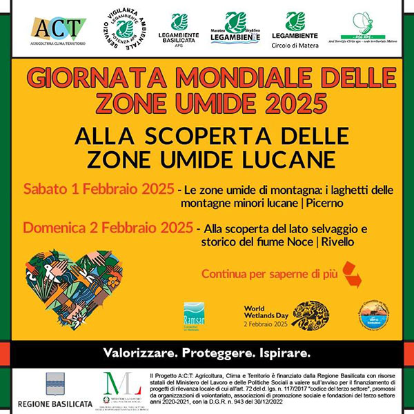 Il World Wetlands Day rientra fra le attività del progetto #ACT, di cui Legambiente Basilicata APS è partner. Progetto Agricoltura, Clima, Territorio (acronimo A.C.T.), finanziato a valere sull’avviso per il finanziamento di progetti di rilevanza locale di cui all’art. 72 del D.lgs. n. 117/2017”, promossi da organizzazioni di volontariato, associazioni di promozione sociale e fondazioni del terzo settore anni 2020-2021 della Regione Basilicata”.