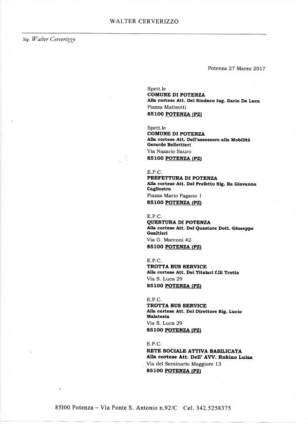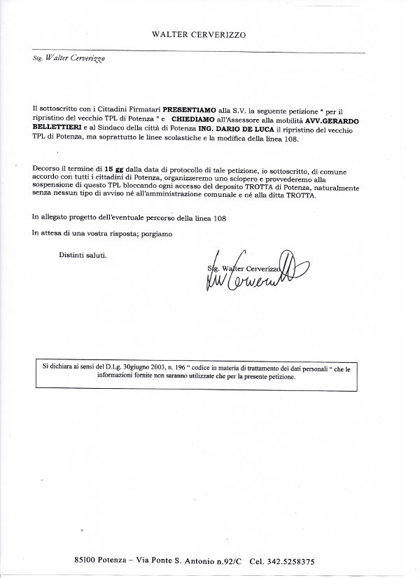 “Ecco la nostra petizione, le firme sono state protocollate Lunedì al comune per il Sindaco e per l’assessore, via mail all’avv. dei consumatori Rubino Luisa e ieri mattina al prefetto di Potenza e alla Questura Di Potenza.