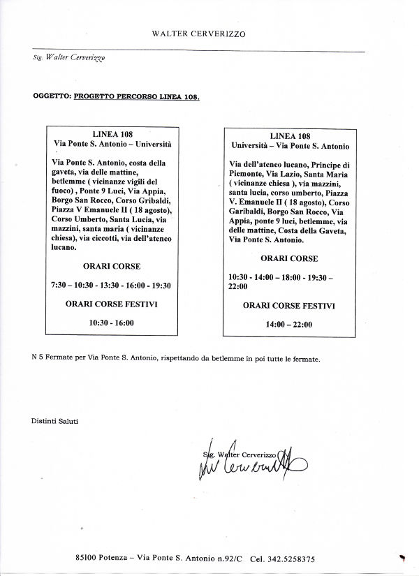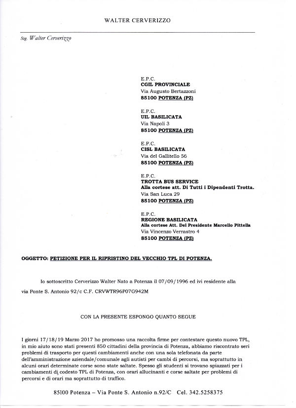 E’ stata consegnata a Potenza la petizione firmata da più di 850 cittadini che dicono “no” ai cambiamenti attuati al nuovo piano di Trasporto Pubblico Locale.