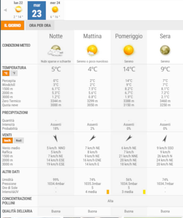 Secondo gli esperti di 3bmeteo, domani, Martedì 23 Febbraio, avremo cielo sereno o poco nuvoloso al mattino, sereno per il resto della giornata.