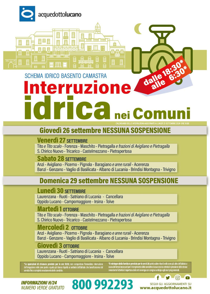 Il Tavolo Tecnico Regionale (del quale fanno parte Prefetture, Protezione Civile, Regione Basilicata, Autorità di Distretto, Egrib, Aziende Sanitarie, Acque del Sud, Arpab, Acquedotto Lucano e Anci) ha stabilito il nuovo programma di sospensioni idriche programmate che interessa i comuni serviti dall’invaso del Camastra, che in questo periodo è caratterizzato da una grave carenza di acqua.