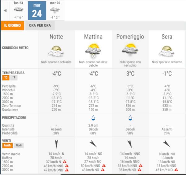 La temperatura massima registrata sarà di 3°C, la minima di -4°C.