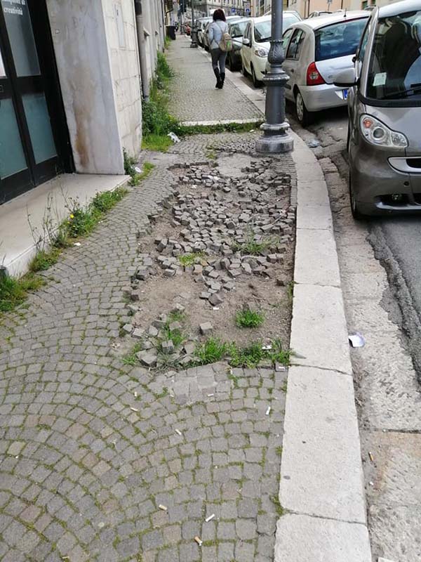 In Via Vaccaro una porzione di marciapiede non è più lastricata dai sampietrini che ormai, liberi dal loro incastro originario, giacciono alla rinfusa su un letto di sabbia.