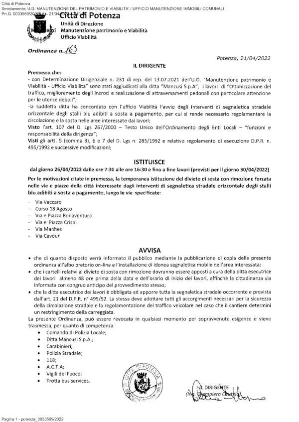 “per l’avvio di interventi di segnaletica stradale orizzontale degli stalli blu adibiti a sosta a pagamento, istituisce dal giorno 26/04/2022 dalle ore 7:30 alle 16:30 e fino a fine lavori (previsti per il 30/04/2022) la temporanea istituzione del divieto di sosta lungo le vie specificate: