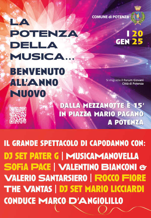 ‘La Festa della Musica…benvenuto all’Anno Nuovo’: questo è il titolo della serata di Capodanno in programma in piazza Mario Pagano, con inizio un quarto d’ora dopo la mezzanotte del 31 dicembre.