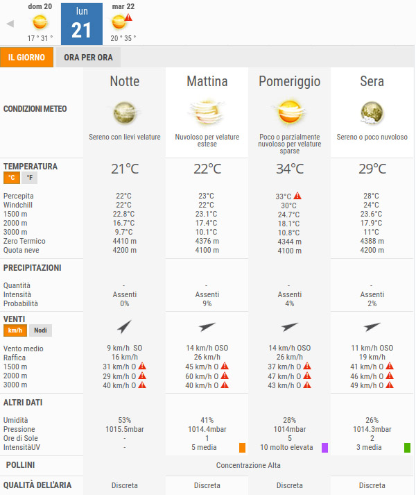 La temperatura massima registrata dovrebbe essere di 35°C, la minima di 21°C.
