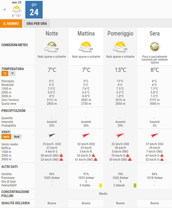 Secondo gli esperti di 3bmeteo, domani, Giovedì 24 Dicembre, avremo nubi sparse alternate a schiarite per l’intera giornata, con tendenza ad ampie schiarite in serata. Non sono previste piogge.