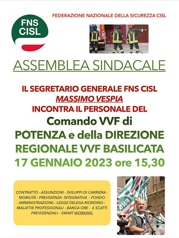 Domani 17 gennaio 2023, in Basilicata sarà in visita il Segretario Generale Nazionale della Federazione Nazionale della Sicurezza Massimo Vespia.