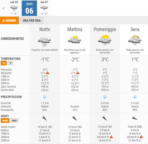 Durante la giornata di dopodomani la temperatura massima registrata pare sarà di 6°C e la minima di -2°C.