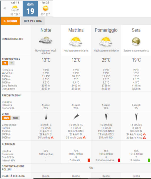 Secondo gli esperti di 3bmeteo, domani, Domenica 19 Luglio, avremo nubi sparse e schiarite al mattino e nel pomeriggio, cielo sereno o poco nuvoloso la sera. Non sono previste piogge.