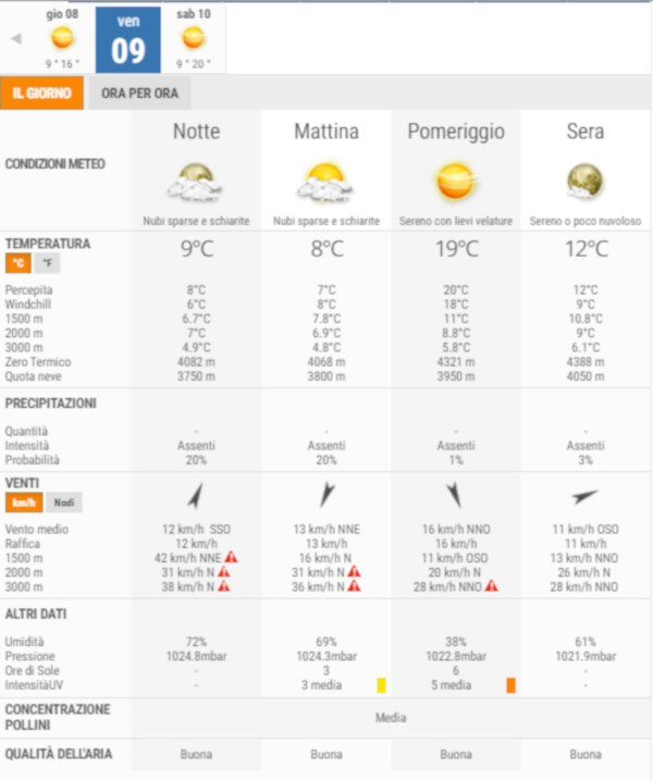 La temperatura massima registrata dovrebbe essere di 20°C, la minima di 9°C.