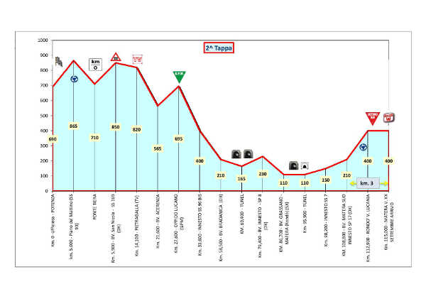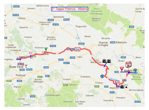 Da Potenza si percorre la zona orientale della provincia tra i comuni di Pietragalla, Oppido Lucano (dove ha sede il velodromo) e Acerenza, tra le alture e le campagne del fiume Bradano (il terzo per lunghezza della regione lucana) fino ad arrivare a Matera, città dichiarata patrimonio mondiale dell’umanità e Capitale Europea della Cultura nel 2019, con arrivo in ascesa per una tappa adatta agli scattisti ma che potrebbe dare un volto definitivo alla classifica finale.