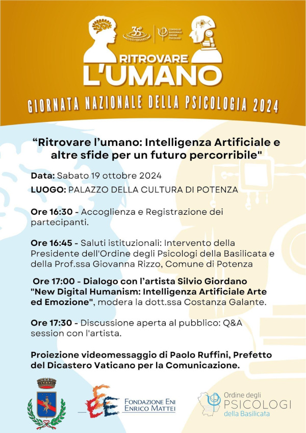 Il tema di quest’anno, “Ritrovare l’umano: Intelligenza Artificiale e altre sfide per un futuro percorribile”, si propone di esplorare l’incontro tra tecnologia e umanità, con un focus particolare sul ruolo dell‘Intelligenza Artificiale nel contesto psicologico, artistico e sociale.