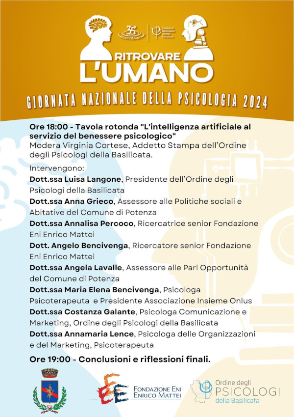 L’Ordine degli Psicologi della Basilicata ha organizzato, nell’ambito della Giornata Nazionale della Psicologia 2024, un’iniziativa che si terrà domani 19 ottobre nel Palazzo della Cultura di Potenza.