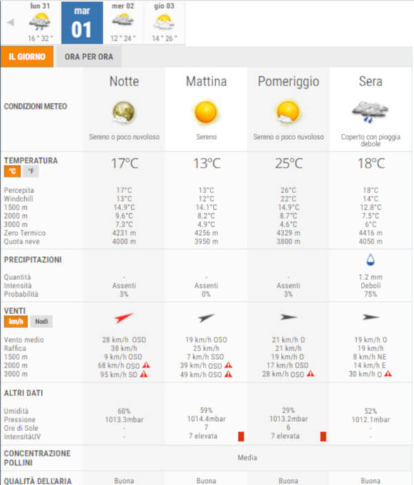 Secondo gli esperti di 3bmeteo, domani, Martedì 1 Settembre, avremo cielo sereno al mattino, sereno o poco nuvoloso nel pomeriggio, coperto con pioggia debole la sera e temperature in netta discesa.