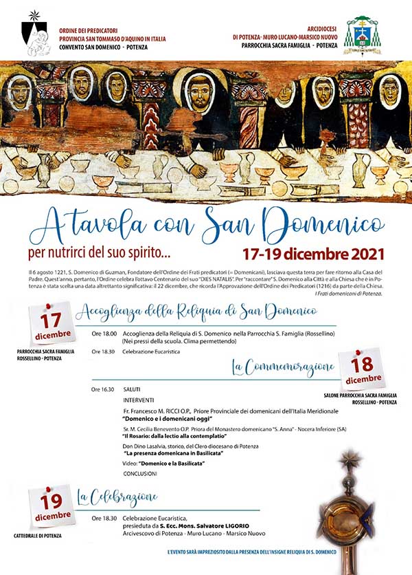 I Frati e le Suore dell’Ordine dei Predicatori (Domenicani) presenti sul territorio lucano (a Potenza i Frati e a Francavilla in Sinni, in Provincia di Potenza, le Suore) quest’anno celebrano l’ottavo centenario della morte (DIES NATALIS) del loro Padre e Fondatore, S. Domenico di Guzman (1171 – 1221).