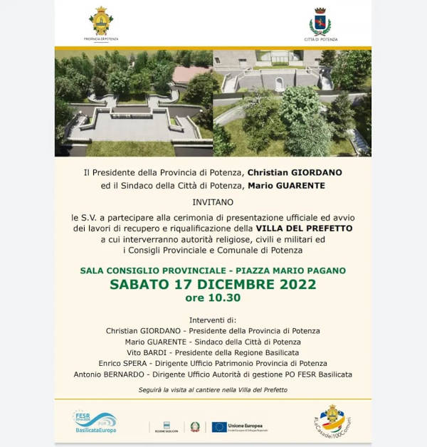 “E dopo l’avvio dei lavori per il Parco della torre Guevara, ecco un altro importante passo per la riqualificazione del centro: sabato 17 Dicembre, alle ore 10:30, insieme al Presidente della Provincia di Potenza presenteremo il progetto di riqualificazione della Villa del Prefetto e daremo ufficialmente inizio ai lavori.