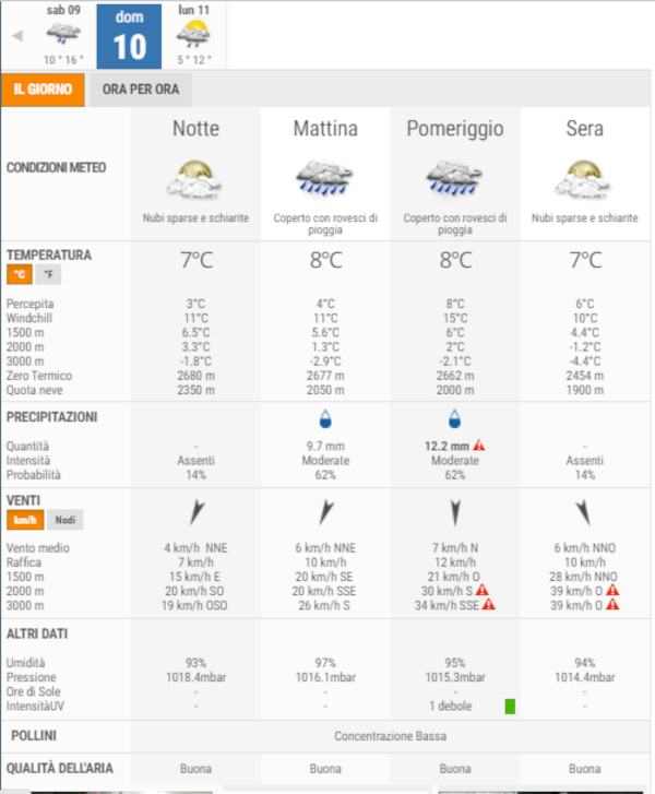 Secondo gli esperti di 3bmeteo, domani, Domenica 10 Ottobre, avremo cielo coperto con rovesci di pioggia il mattino e il pomeriggio, nubi sparse e schiarite la sera.