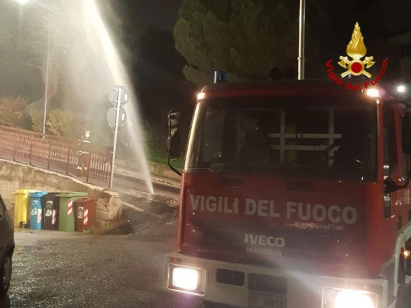 Giunti in sul posto hanno trovato un foro sul manto stradale da dove fuoriusciva un getto d’acqua ad alta pressione alto più di 10 metri.