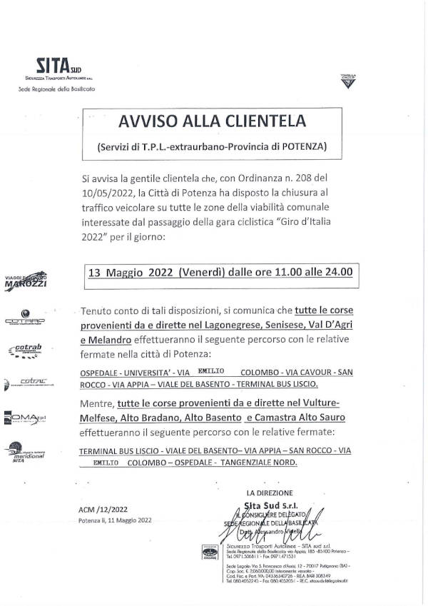 “In virtù della chiusura al traffico di diverse vie cittadine interessate dal passaggio del Giro d’Italia 2022 disposte con Ordinanza n. 208 del 10/5/2022, venerdì 13 maggio 2022 tutte le corse dei bus extraurbani nel loro transito sul territorio comunale di Potenza subiranno modifiche di percorso e relative fermate”.