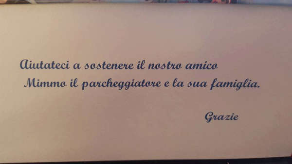 Domani mattina i promotori di questa iniziativa solidale, doneranno alla moglie di Mimì i fondi raccolti (190 euro in un giorno e mezzo).