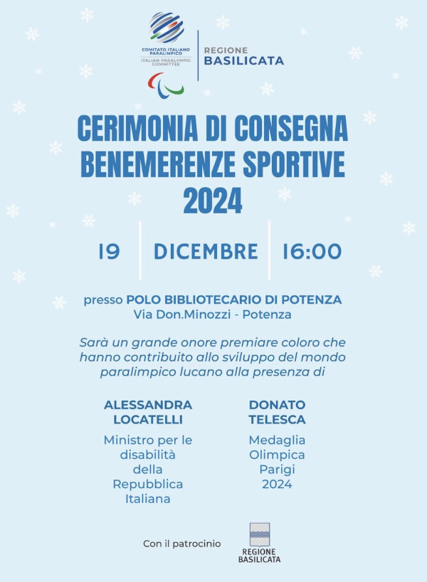 Con il patrocinio della Regione Basilicata e in collaborazione con il Polo Bibliotecario, il Comitato Italiano Paralimpico C.R. Basilicata, vuole celebrare i talenti dello Sport Paralimpico Lucano, tramite una cerimonia di consegna di benemerenze il giorno 19 Dicembre 2024 presso il Polo Bibliotecario di Potenza, a partire dalle ore 16:00.