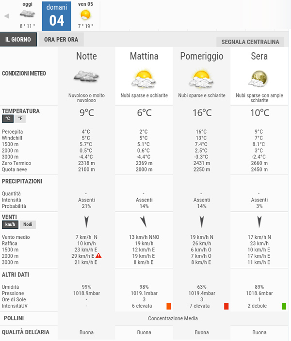 Secondo gli esperti di 3bmeteo, domani, Giovedì 4 Maggio, avremo nubi sparse alternate a schiarite per l’intera giornata con tendenza ad ampi rasserenamenti in serata.