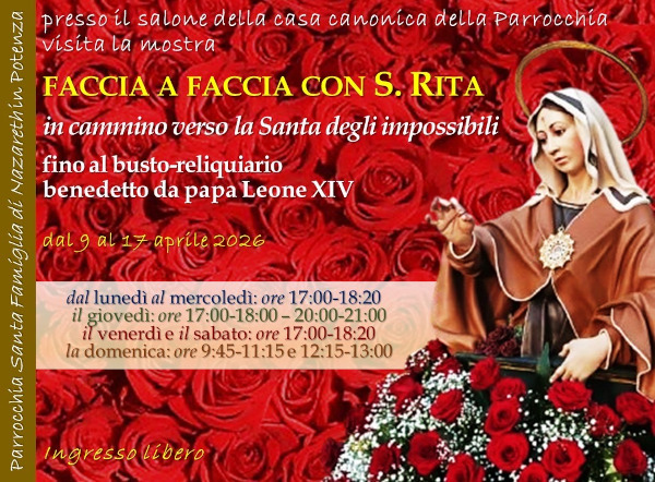 Grata per la benedizione che papa Leone XIV ha impartito al busto reliquiario di Santa Rita durante l’Udienza generale dell’8 aprile 2026, la Parrocchia Santa Famiglia di Nazareth (Rione Rossellino) invita tutti a visitare la mostra Faccia a faccia con S. Rita, allestita nei locali parrocchiali.