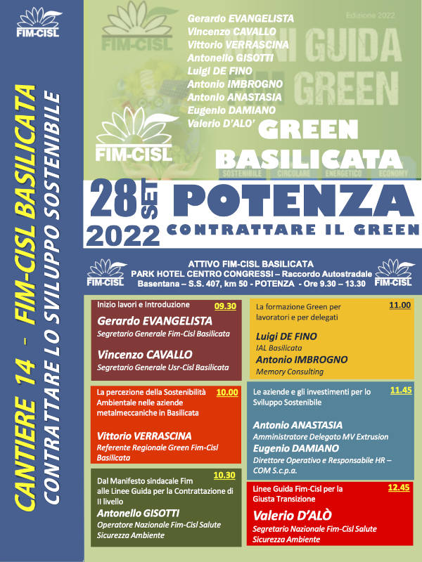 La Fim Cisl ha programmato per Mercoledì 28 Settembre, al Park Hotel di Potenza, dalle 9:30 alle 13:30, una giornata di informazione e formazione per approfondire i temi legati allo sviluppo sostenibile e alla transizione green.