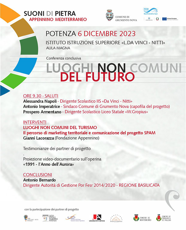 Il progetto “Suoni di Pietra Appennino Mediterraneo” (S.P.A.M) si racconta e si conclude mercoledì 6 Dicembre all’I.I.S “Da Vinci Nitti” (via Ancona) presentando un percorso durato due anni e i risultati conseguiti attraverso attività di formazione, di ricerca, di eventi, di promozione del territorio.