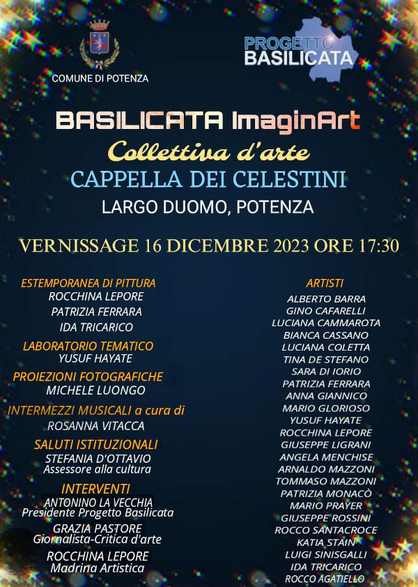 Sabato 16 dicembre alle ore 17:30 nella Cappella dei Celestini a Potenza, si svolgerà il vernissage della collettiva d’arte “Basilicata ImaginArt”.