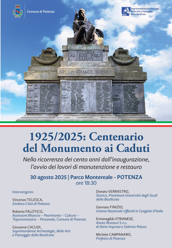 Molto c’è ancora da dire e da scoprire sui primi cento anni del Monumento, ma certamente si tratta di un’opera che nella storia del capoluogo lucano rappresenta un capitolo di grande rilievo, capace di raccontarci un po’ di quel che eravamo, di quello che siamo diventati, della capacità di essere comunità, che muovendo dal sacrificio dei nostri concittadini, passando per l’impegno di chi ha voluto onorare la loro memoria, ci conduce a oggi, ad avviare il restauro, che vuole sì riparare le rughe determinate dal trascorrere del tempo, ma che vuole soprattutto risvegliare nei cuori di tutti, quel legame, quell’affetto, quella capacità di donarsi vicendevolmente, vie privilegiate per essere autenticamente comunità” conclude Falotico.