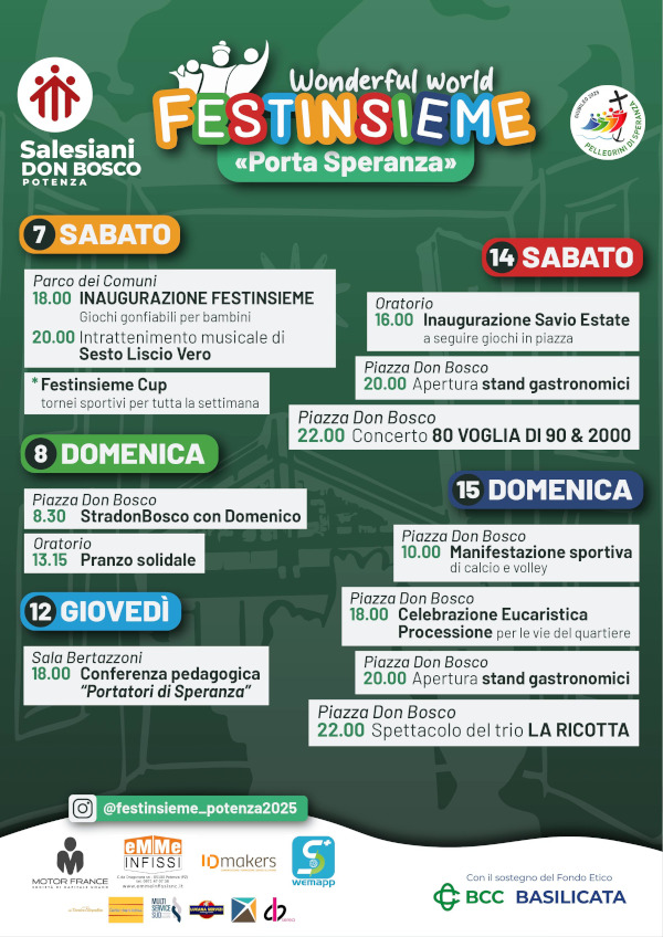 Dopo le festività per il Santo Patrono, anche quest’anno, si anima un’altra piazza importante della città, Piazza Don Bosco, con Festinsieme 2025: un’intensa settimana di eventi di carattere culturale, artistico, sportivo, musicale e religioso che coinvolgeranno non solo il quartiere di Rione Risorgimento e di Parco Aurora ma l’intera città.