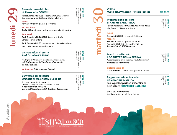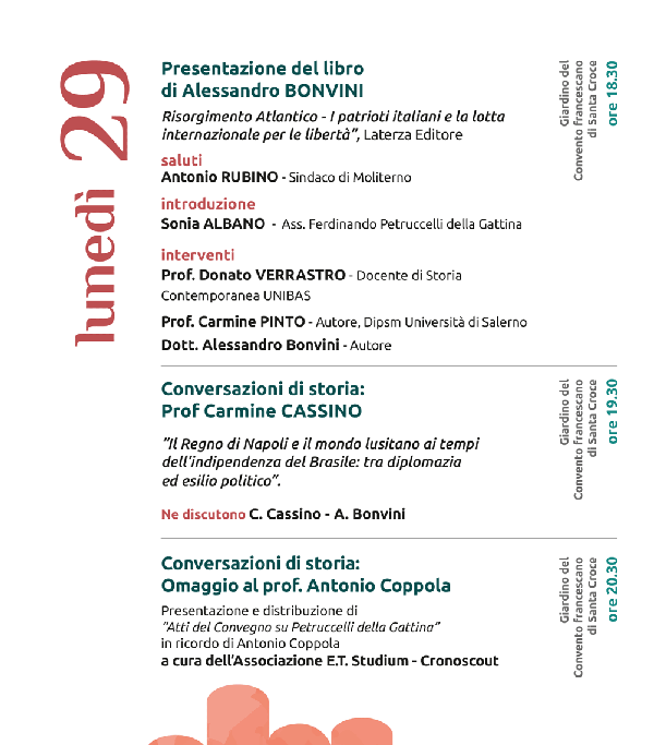 - a seguire Conversazioni di Storia sul tema “Il Regno di Napoli e il mondo lusitano ai tempi dell’indipendenza del Brasile: tra diplomazia ed esilio politico”;