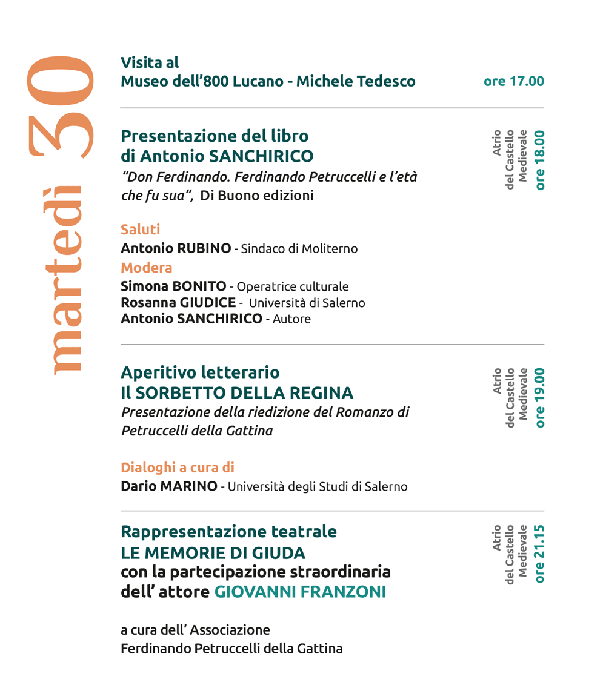 La serata del 30 Agosto è interamente dedicata allo scrittore e giornalista Ferdinando Petruccelli della Gattina.