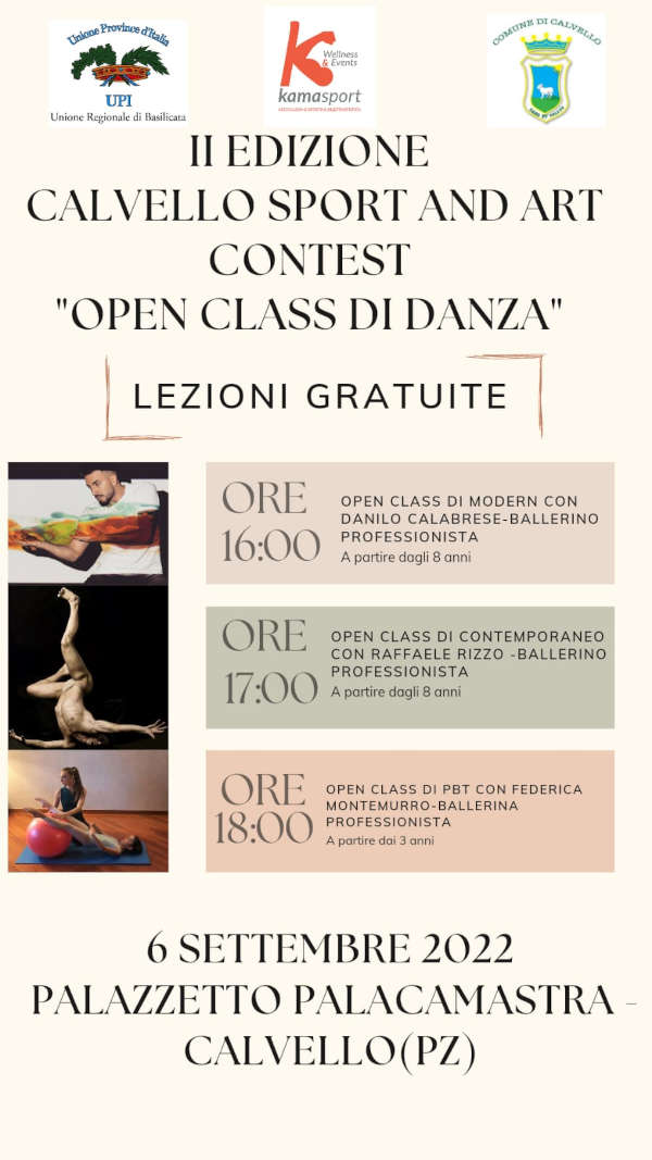 Presso il Palazzetto Palacamastra, i ballerini professionisti Raffaele Rizzo (risorsa brillante del territorio lucano), Federica Montemurro, danzatrice pugliese e Danilo Calabrese, originario della Calabria, terranno degli Stage di Danza, nello specifico: