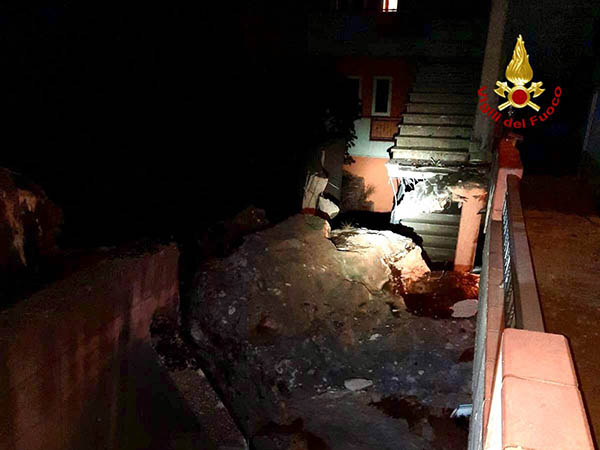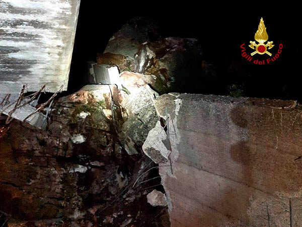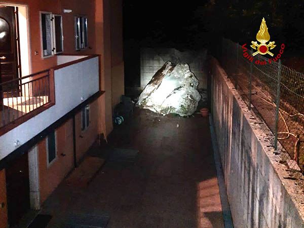 Arrivati sul luogo di intervento hanno trovato 3 massi rocciosi di circa 4 metri cubi di volume che, rotolando giù da una parete rocciosa adiacente, sono impattati sui fabbricati provocando vistosi danni.