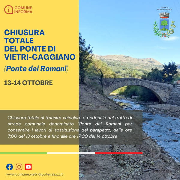 “la chiusura totale al transito veicolare e pedonale del tratto di strada comunale denominato ‘Ponte dei Romani’ per consentire i lavori di sostituzione del parapetto: