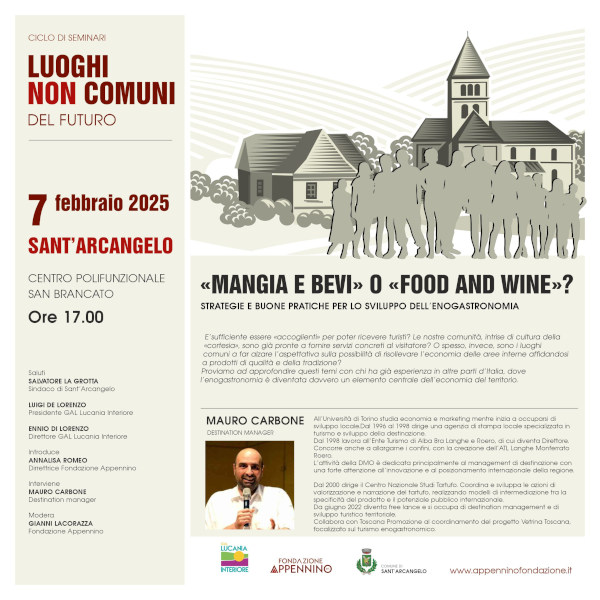 Il GAL Lucania Interiore e la Fondazione Appennino, dal 7 Febbraio al 21 Marzo 2025, promuovono il ciclo di seminari “Luoghi non comuni del futuro“, un’iniziativa che si articola in cinque incontri con l’obiettivo di esplorare nuove strategie per lo sviluppo e la valorizzazione delle aree interne, con focus su enogastronomia, turismo, piccoli comuni, innovazione e lavoro di comunità.